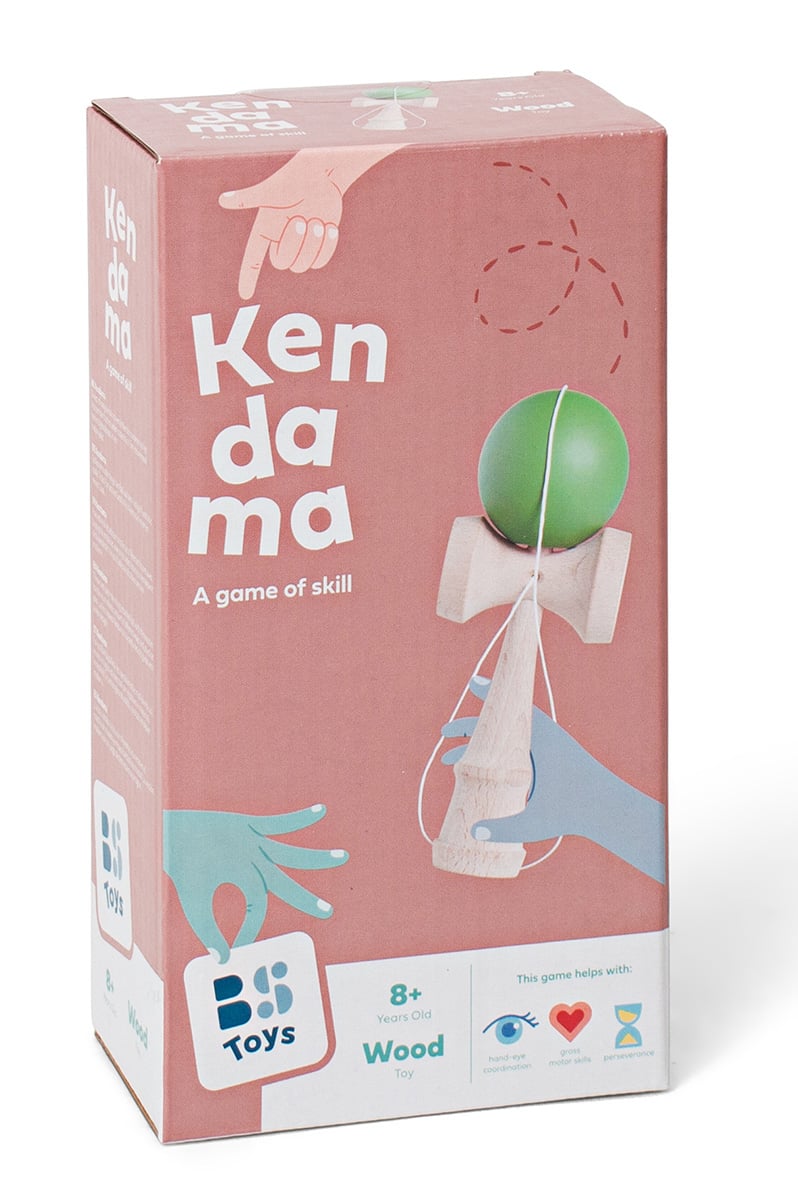 Kendama este un joc vechi de secole, ce provine din cultura japoneza, cu un design nou, fiind foarte popular si indragit si in zilele noastre. Jucaria este compusa dintr-un suport din lemn prevazut cu un maner si varf si doua cupe, de care este atasata printr-un snur o minge cu un orificiu. Jocul presupune prinderea mingii din lemn (Dama) intr-una din cavitatile suportului numit Ken. Cavitatile au diferite dimensiuni si pozitii, fiecare corespunzand unui nivel de dificultate. Jucatorii pot arunca si prinde mingea, atasata prin snur manerului din lemn, intr-o varietate nesfarsita de moduri si pot exersa miscari complicate. Kendama antreneaza mintea si testeaza indemanarea jucatorilor. Desi poate parea simplu, jocul necesita exercitiu si coordonare perfecta, jucatorul solicitandu-si nu numai mainile, ci si intregul corp pentru a putea manevra cu succes jucaria. In plus, jocul este foarte distractiv, generand un adevarat spectacol cu miscari interesante si de efect, jucatorii putand sa isi creeze un stil propriu cu miscari specifice. Pachetul contine:- 1x Kendama